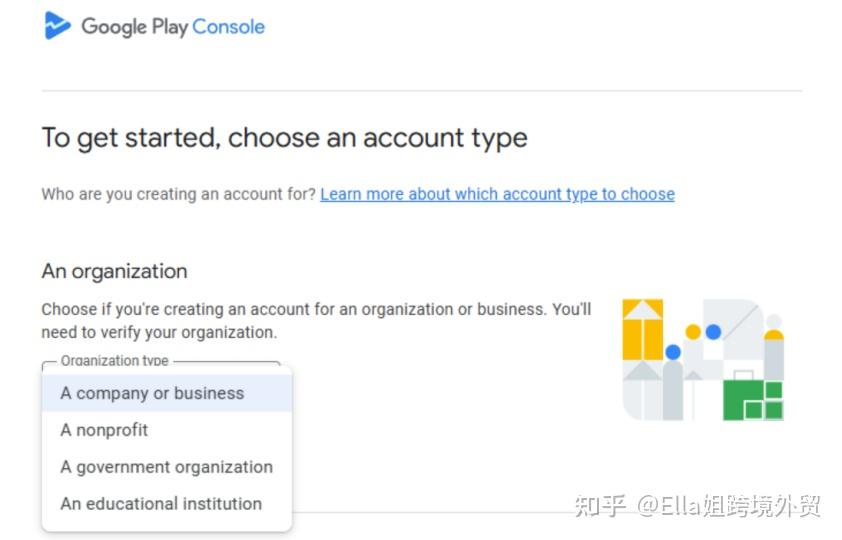 前往Google Play Console,登录Google账号。既然是组织账号,那就在“An organization”这一栏进行选择,一般以企业类型为主,在下拉框中选择a company or business。